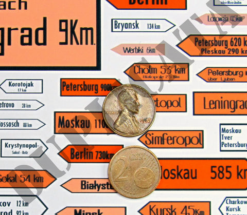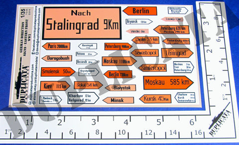 - Largest sign "Nach Stalingrad..." measures approx. 2 5/8" x 1 3/16" (6.6 x 3 cm).